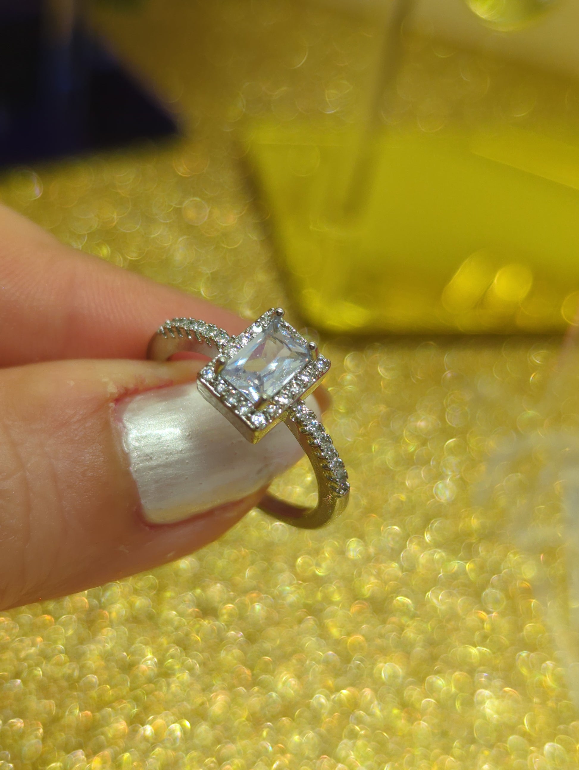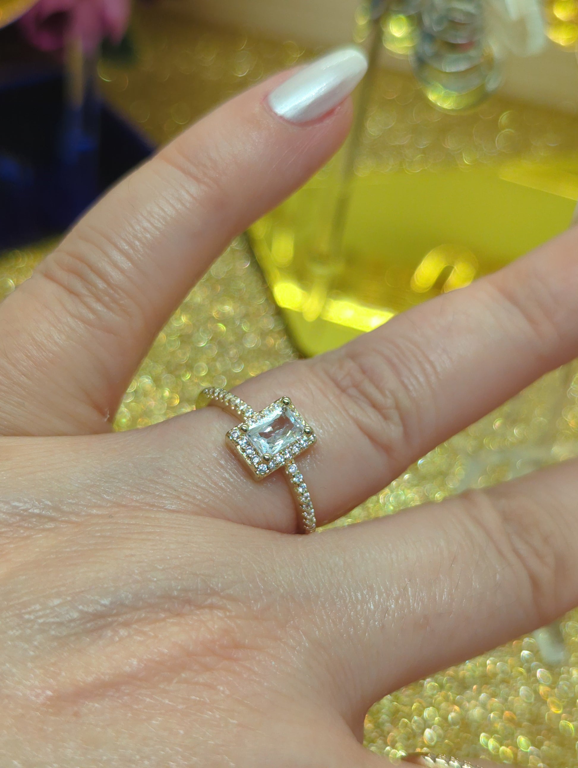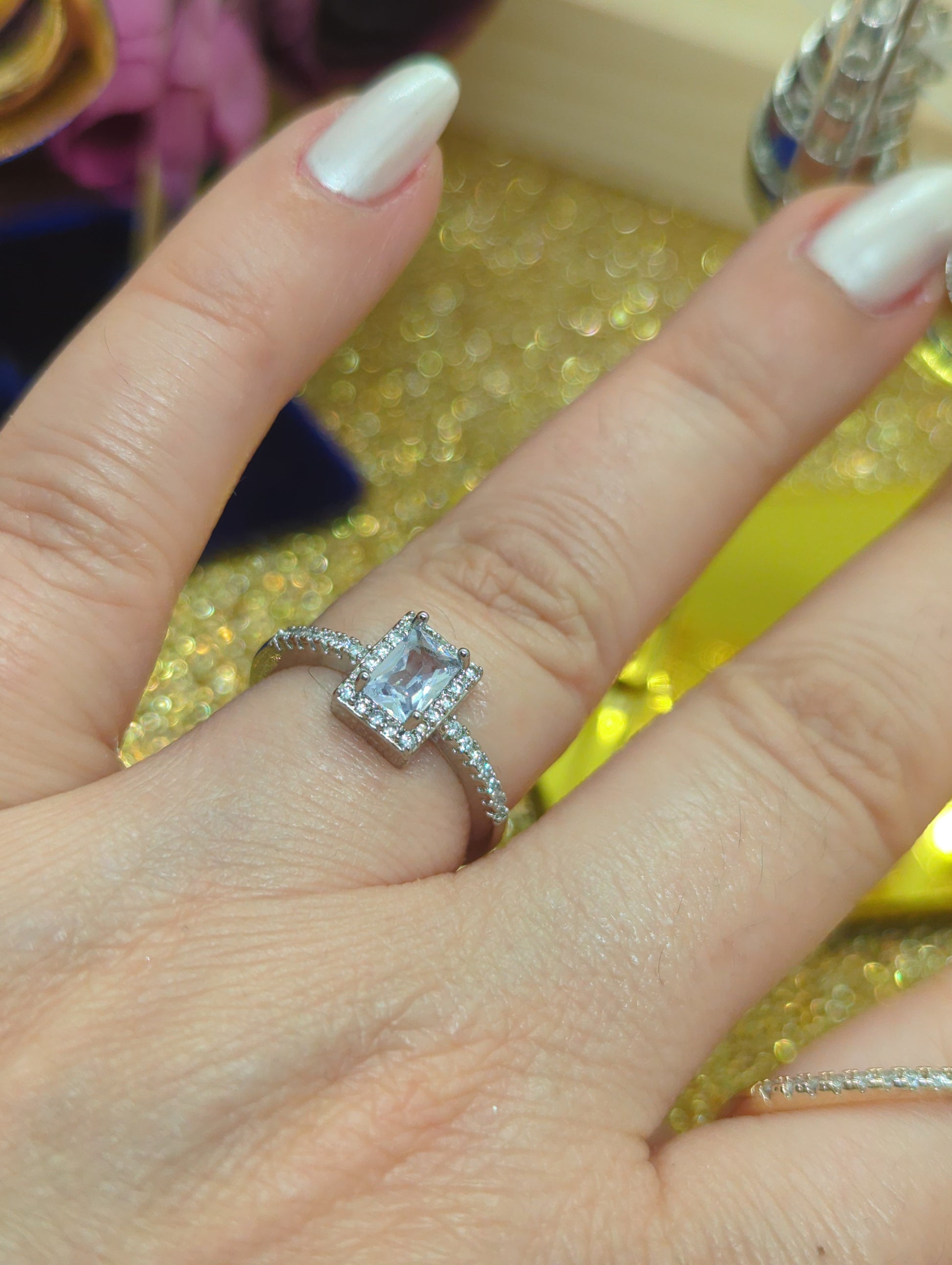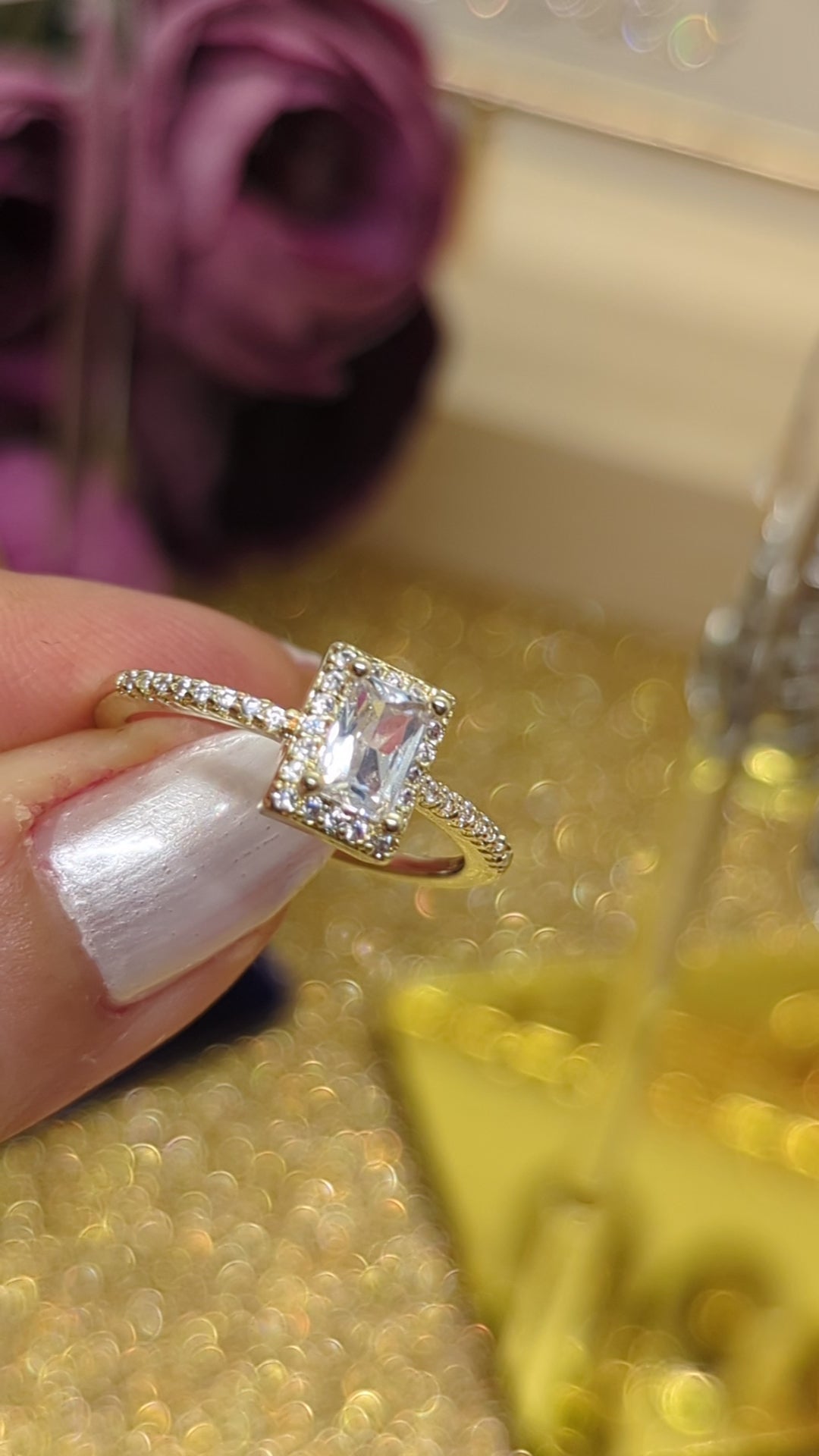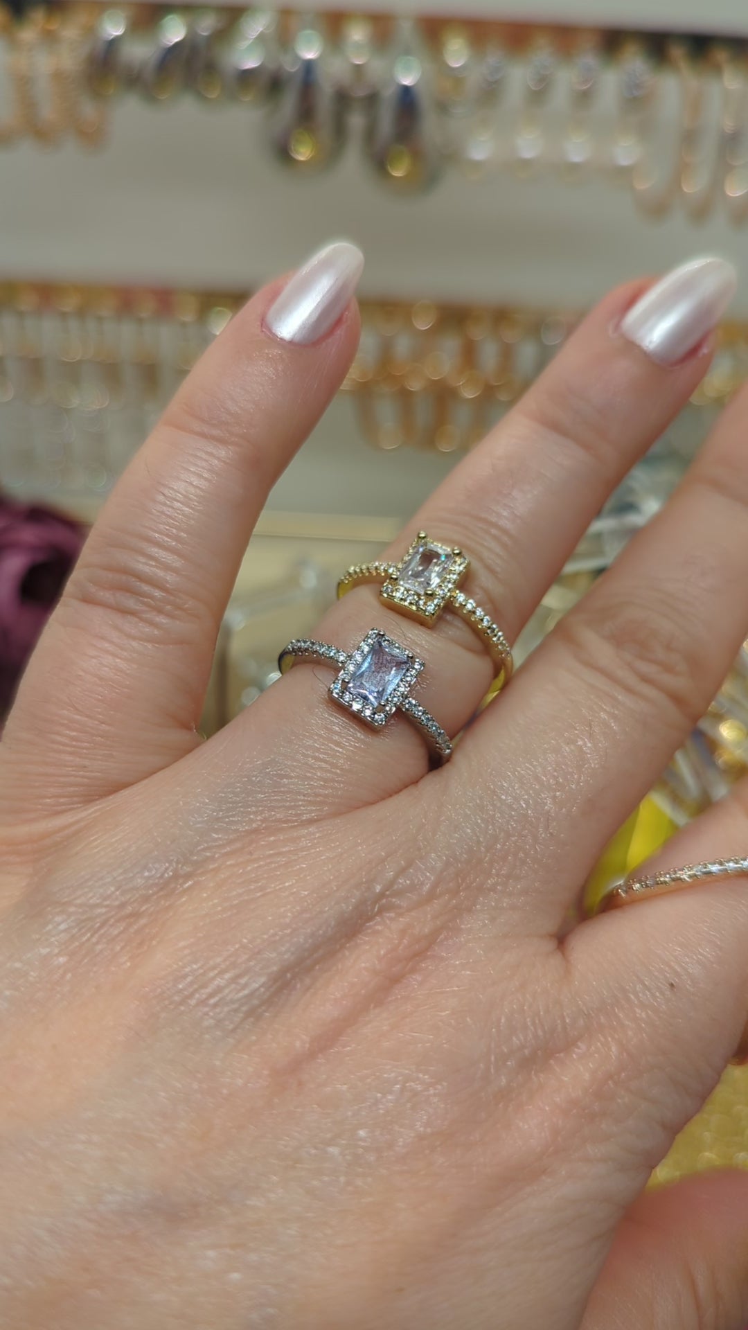Diese zeitlosen Solitär-Ringe sind ein echter Blickfang. Der zarte Smaragdschliff des zentralen Steins wird von funkelnden Zirkonia wunderschön umrahmt. Die Ringe sind in zwei Farben erhältlich: klassisches Silber und warmes Gold. Egal für welche Farbe Sie sich entscheiden, dieser Ring ist das perfekte Accessoire für jeden Anlass.