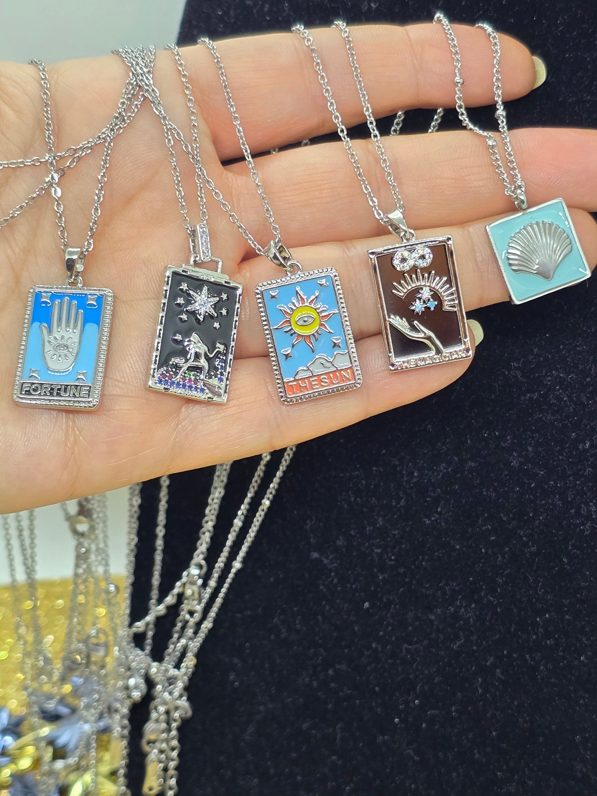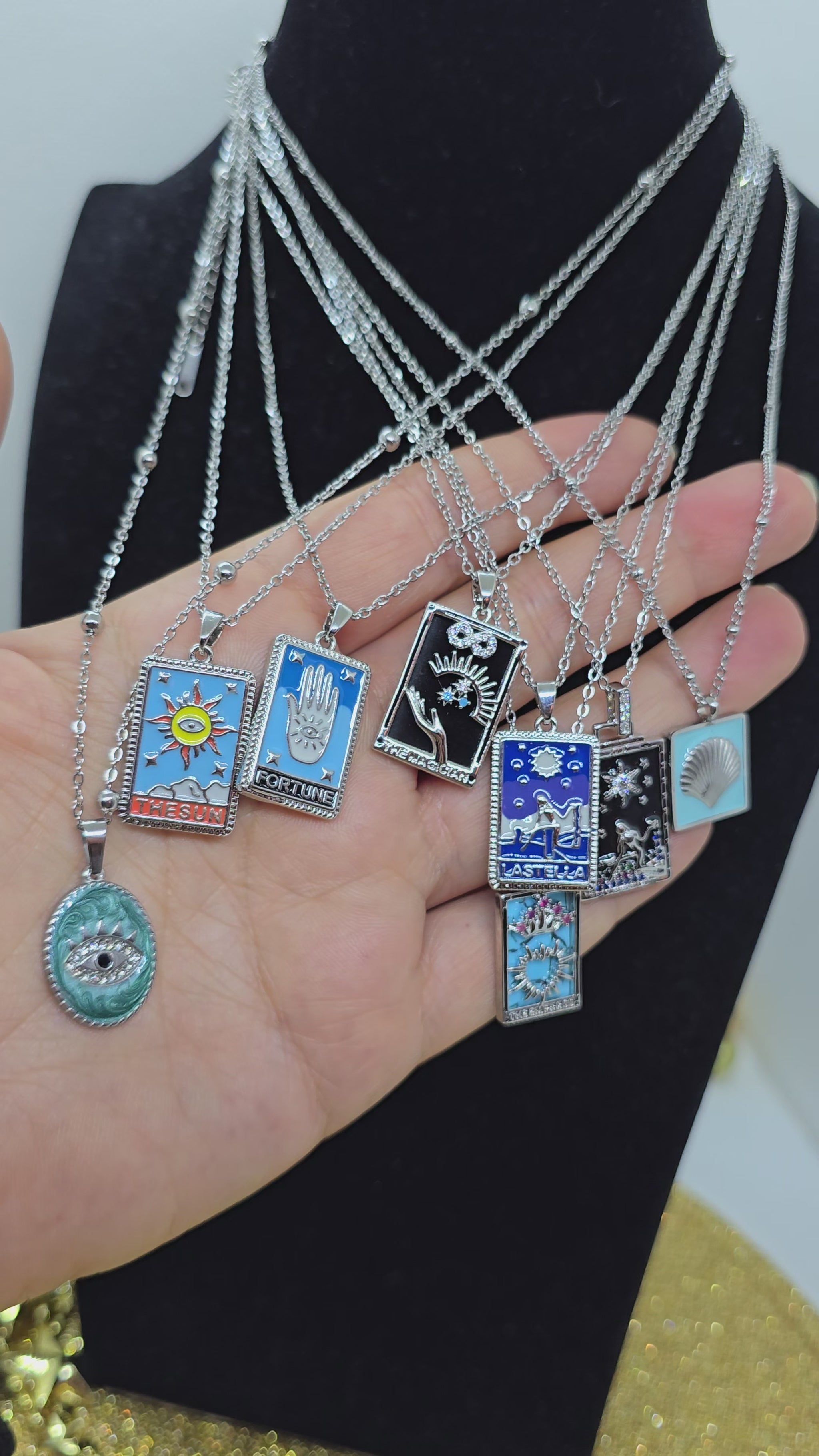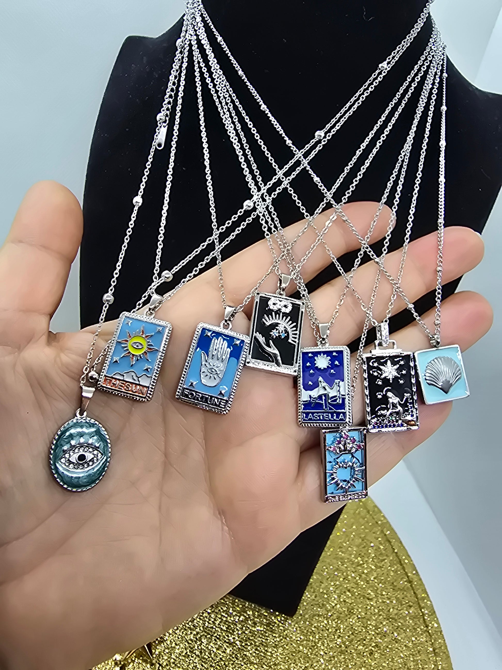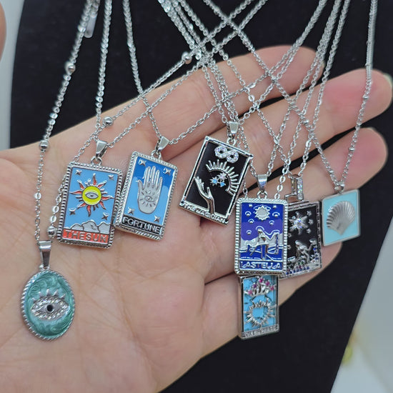 Tarot-Halskette – Mystische Schönheit. Tarot-Anhänger mit funkelnden Steinen. Spiele mit dem Schicksal.