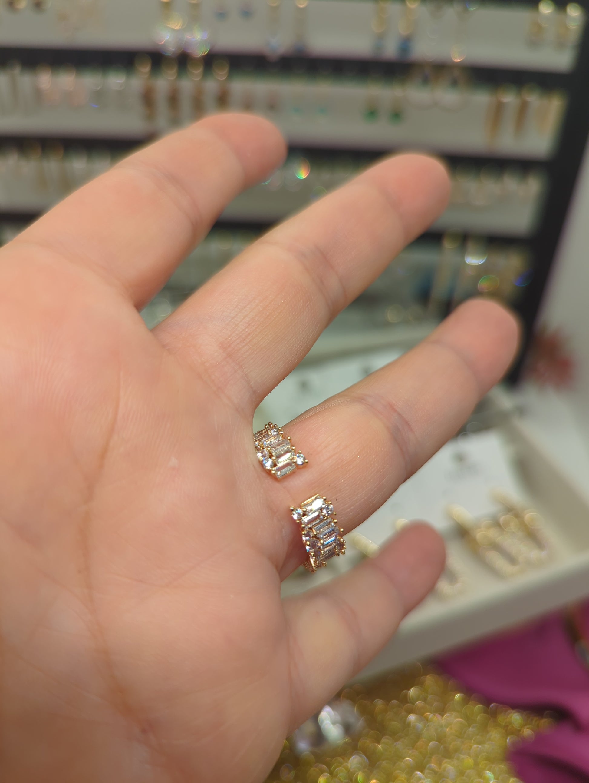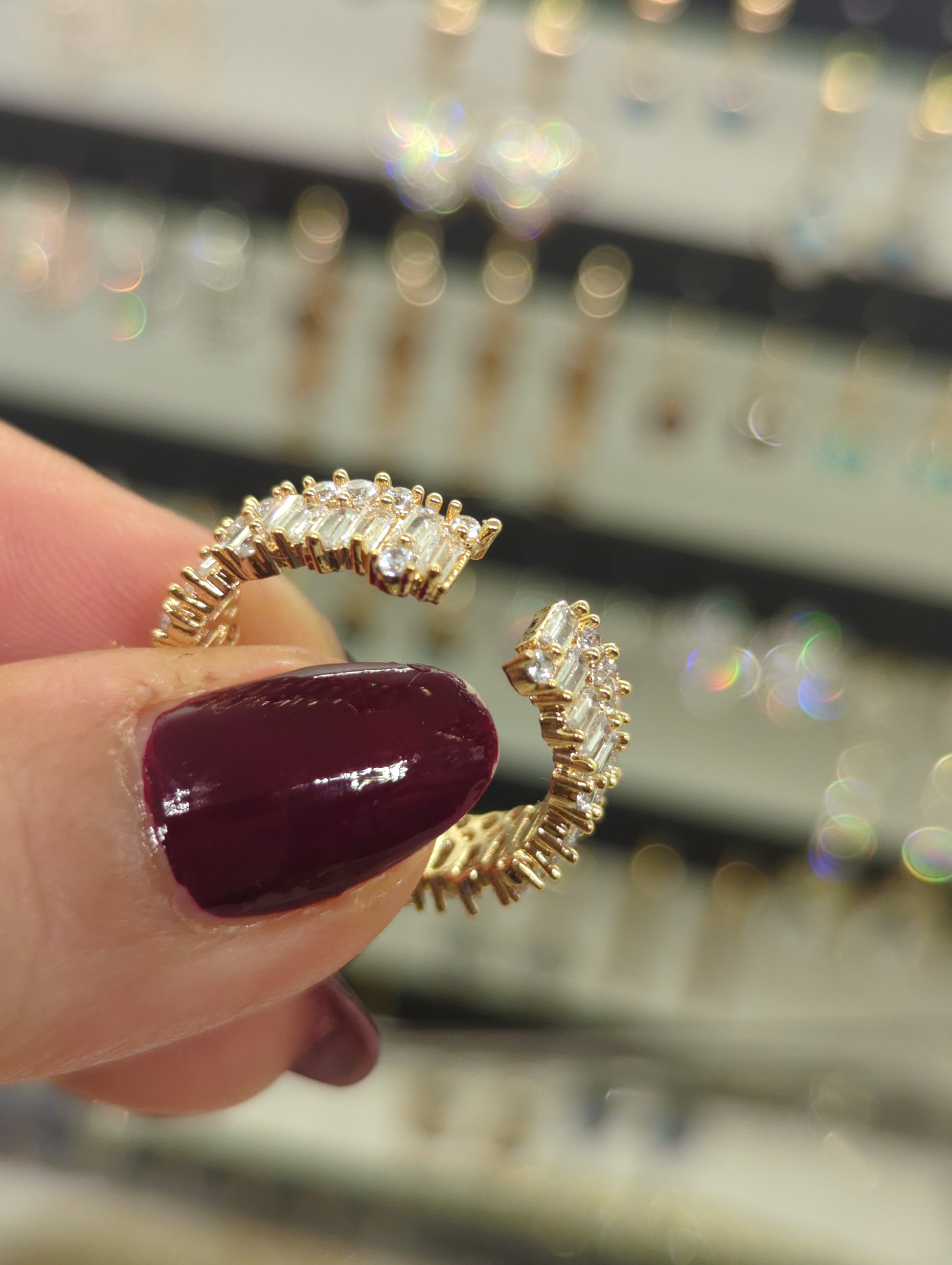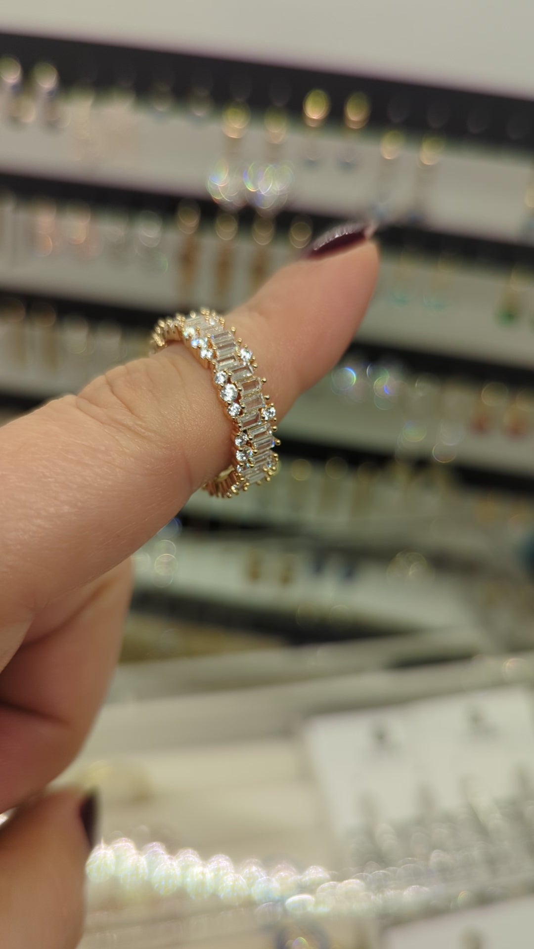 Introducing our stunning Zircon Stone Ring from the Baguette Jewelry Collection. This elegant ring showcases a series of shimmering cubic zirconia stones arranged in a sophisticated baguette cut. The gold-tone metal band adds a touch of luxury, making it perfect for both everyday wear and special occasions. Its adjustable design ensures a comfortable fit for various finger sizes.
