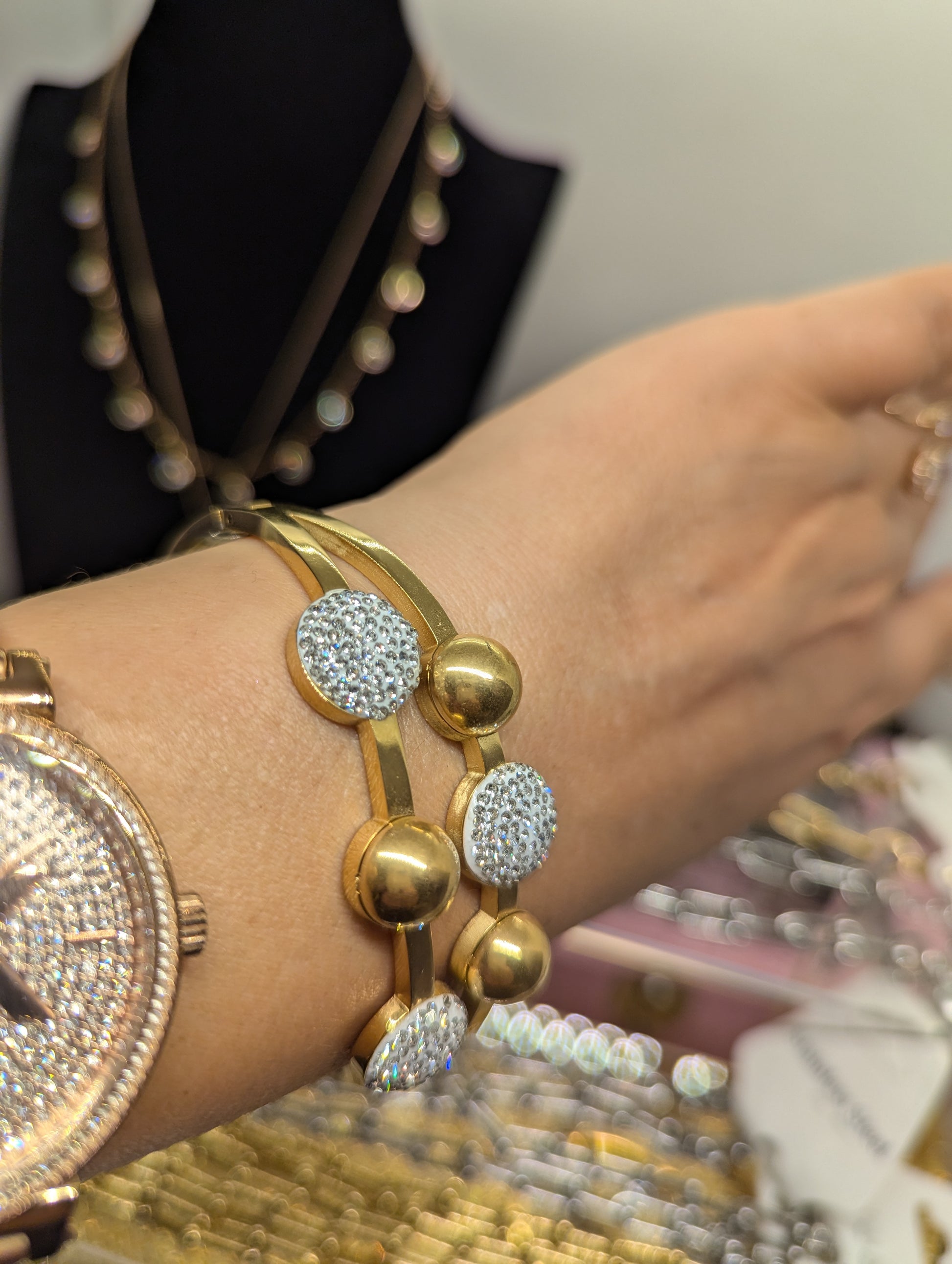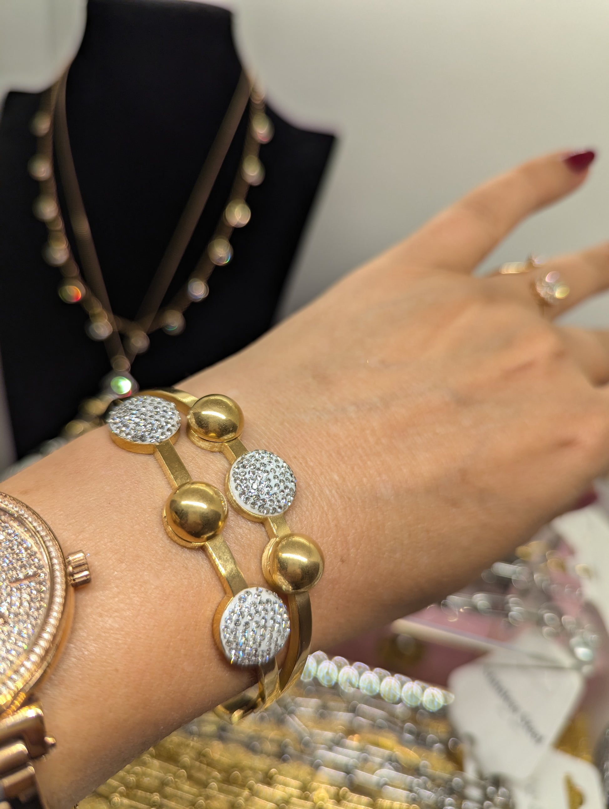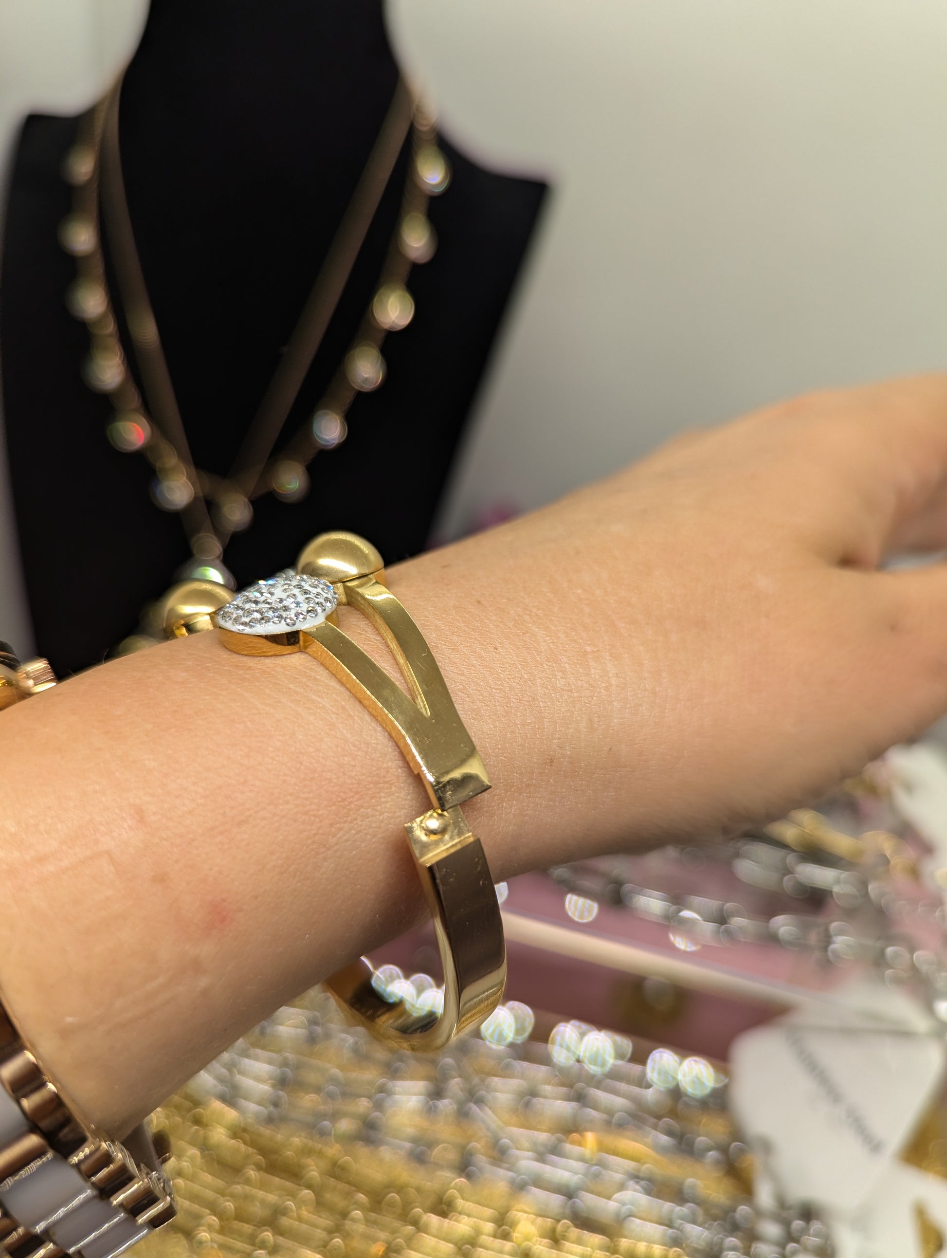 Eleganter Goldener Armreif aus Edelstahl mit funkelnden Kristallen. Der zeitlose Design und der komfortable Verschluss machen dieses Armband zu einem absoluten Must-have für jede Schmucksammlung. Handgefertigt mit Liebe zum Detail.