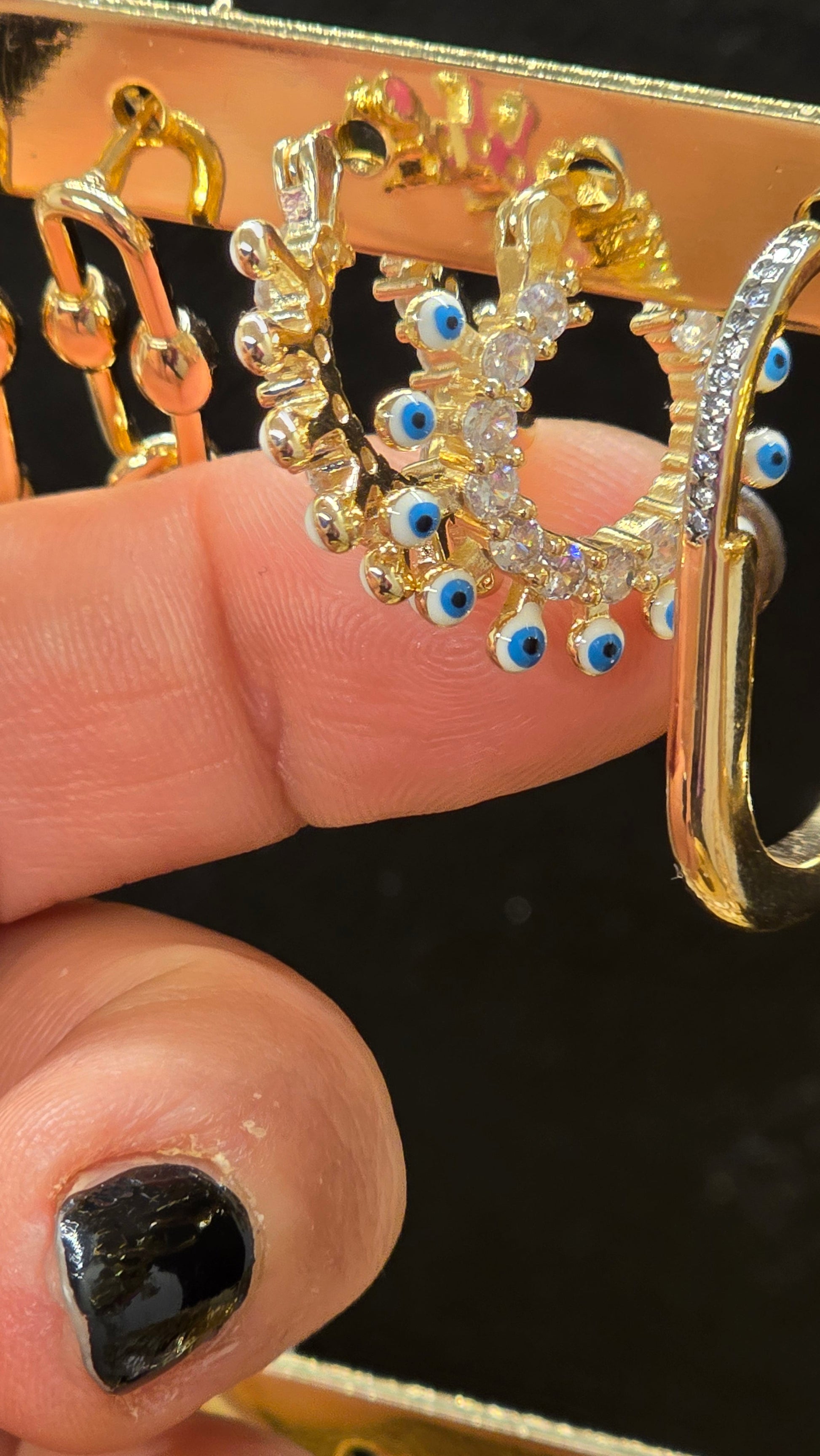 Elegant gold-plated earrings with sparkling cubic zirconia stones and characteristic blue evil eye beads. The elaborate chandelier design adds a special sparkle to any outfit.